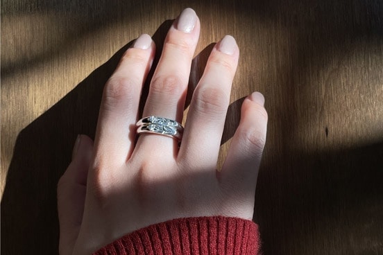 ローズリング 一輪の薔薇を手に添えて。 花の女王と呼ばれる薔薇。「美」「愛」「成功」「栄光」「喜び」を追求する力を与えてくれる。そんな勇気出るモチーフです。 【素材】SV925+ロジウムコーティング 【サイズ】*幅上:4mm*幅下:2mm*厚み:2mm *10~13号